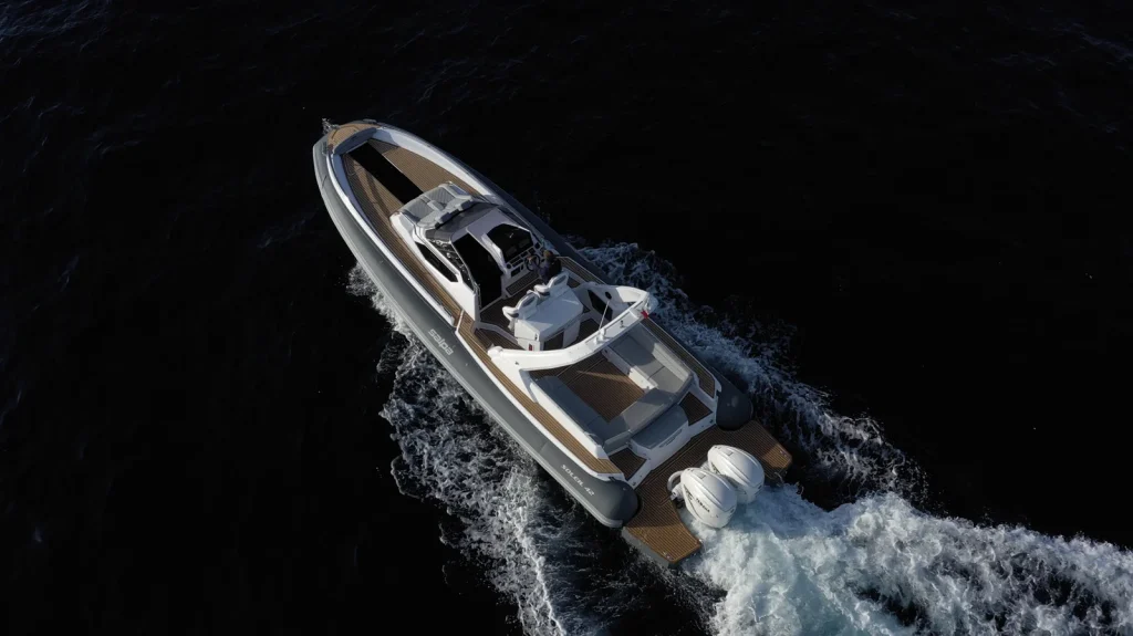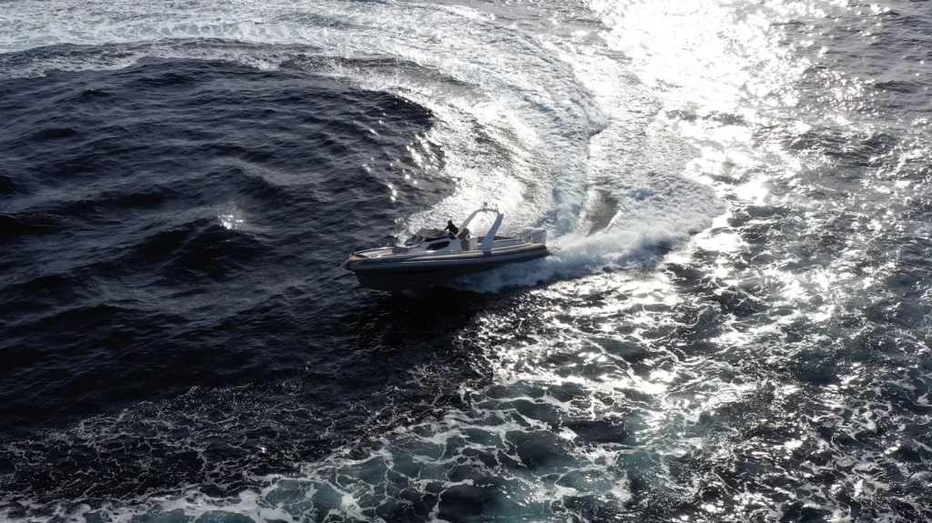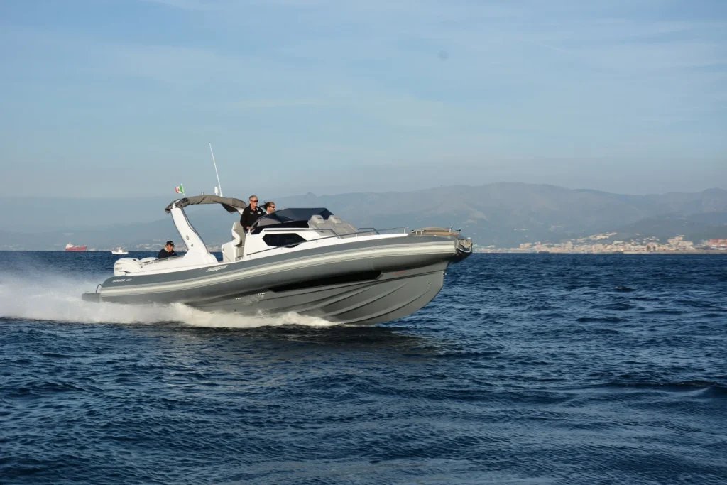 Cela grâce à la carène créée en collaboration avec le spécialiste anglais Adam Younger, designer de renommée internationale connu pour ses coques de course, qui a conçu une carène double marche performante avec une étrave verticale droite.
